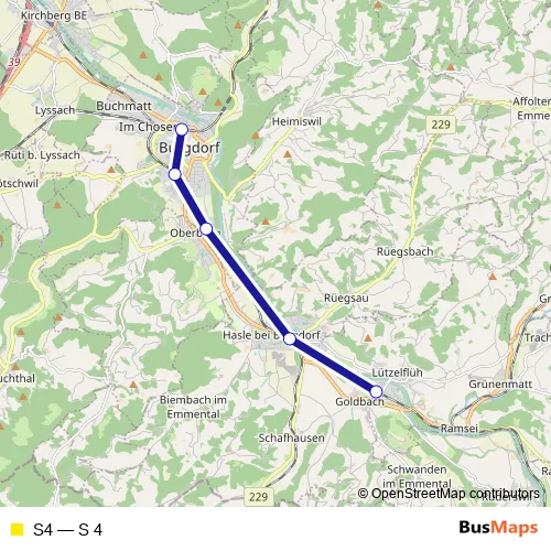 The first stop of the S4 rail route is Lützelflüh-Goldbach and the last stop is Burgdorf. S4 (S 4) is operational during everyday.