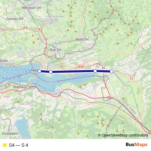 The first stop of the S4 rail route is Uznach and the last stop is Rapperswil Sg. S4 (S 4) is operational during everyday.