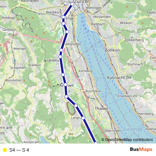 The first stop of the S4 rail route is Zürich Selnau and the last stop is Sihlwald. S4 (S 4) is operational during everyday.