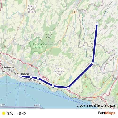 The first stop of the S40 rail route is Lausanne and the last stop is Vauderens. S40 (S 40) is operational during on weekdays.