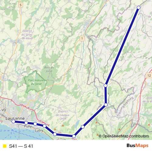 The first stop of the S41 rail route is Romont Fr and the last stop is Lausanne. S41 (S 41) is operational during everyday.