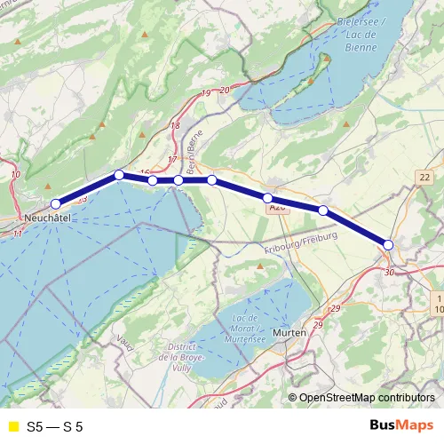 The first stop of the S5 rail route is Kerzers and the last stop is Neuchâtel. S5 (S 5) is operational during everyday.