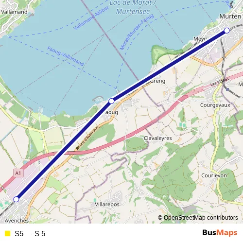 The first stop of the S5 rail route is Avenches and the last stop is