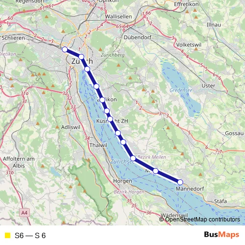The first stop of the S6 rail route is Zürich Hardbrücke and the last stop is Uetikon. S6 (S 6) is operational during everyday.