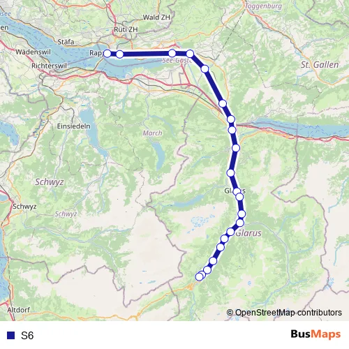 The first stop of the S6 rail route is Rapperswil Sg and the last stop is Linthal. S6 is operational during everyday.