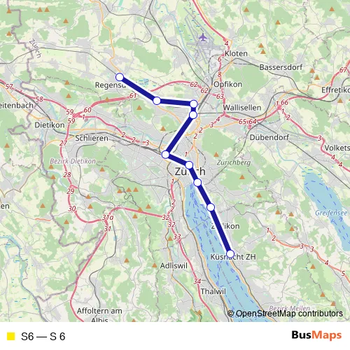 See why over 2 million users trust and consider busmaps.com as the best public transport website. busmaps gives you Zuerich Rail Services suggested routes, real-time bus tracker, line route maps in Zuerich, and helps to find the closest S6 rail stops near you. No internet available? Download an offline PDF map and bus schedule for the S6 rail to take on your trip.