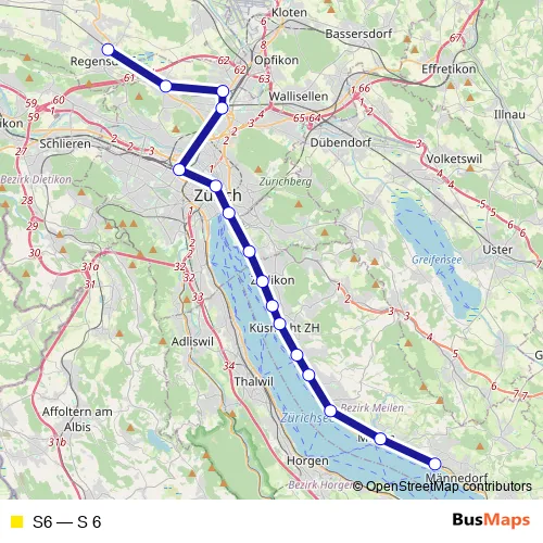 The first stop of the S6 rail route is Uetikon and the last stop is Regensdorf-Watt. S6 (S 6) is operational during everyday.