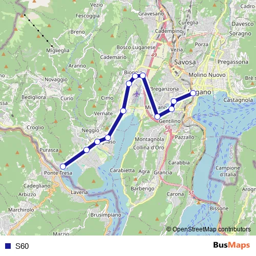 The first stop of the S60 rail route is Lugano Flp and the last stop is Ponte Tresa. S60 is operational during everyday.