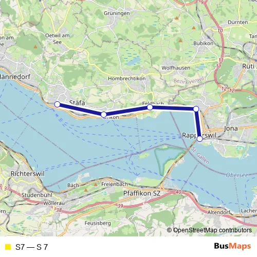 The first stop of the S7 rail route is Stäfa and the last stop is Rapperswil Sg. S7 (S 7) is operational during everyday.