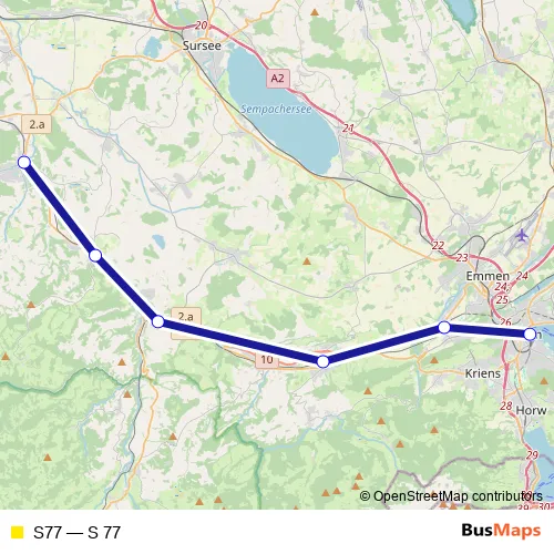 The first stop of the S77 rail route is Willisau and the last stop is Luzern. S77 (S 77) is operational during on weekdays.