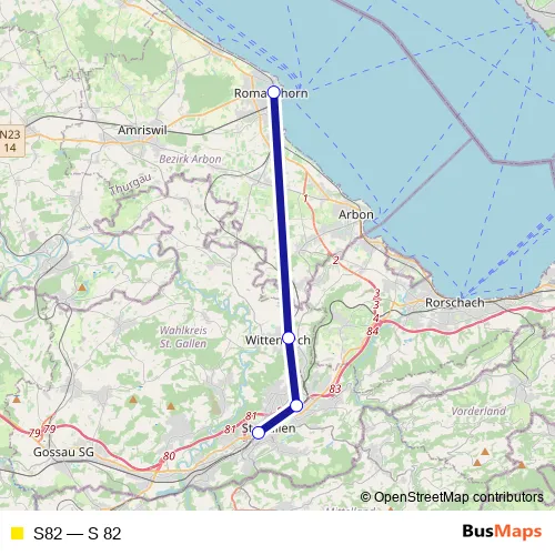 The first stop of the S82 rail route is Romanshorn and the last stop is St. Gallen. S82 (S 82) is operational during on weekdays.