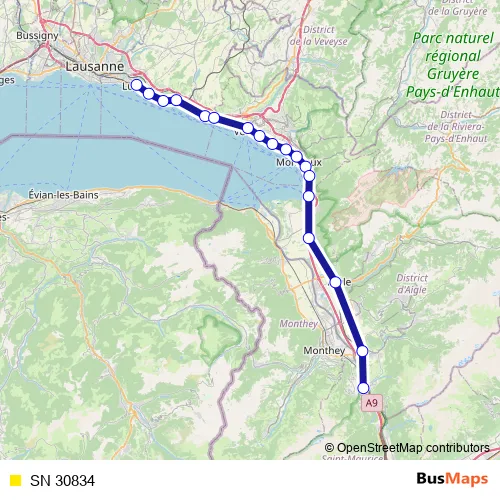 The first stop of the SN 30834 rail route is Lutry and the last stop is