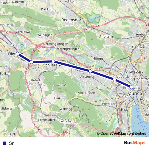 The first stop of the Sn rail route is Zürich Hb and the last stop is Dietikon. Sn is operational during everyday.