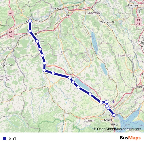 The first stop of the Sn1 rail route is Luzern and the last stop is Olten. Sn1 is operational during on weekends.