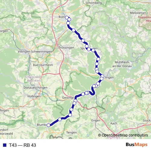 Bahnhof - Rottweiler Straße - Im Kapellenösch - Bluttenbühl - Bahnhofstraße - Robert-Koch-Straße - Daimlerstraße - Primstraße - Dürbheimer Straße - Eisenbahnstraße - Bahnhofbrücke - Friedrichstraße - Max-Planck-Straße - Christian-Scheerer-Straße - Gotenstraße - Bischofszeller Straße - Im Anger - Fabrikstraße - Im Stockäcker - Am Bahnhof - Kirchtalstraße - Am Bahnhof - Bahnhofstraße