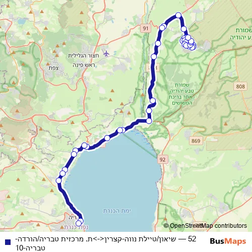 The first stop of the 52 bus route is Sion/Naveh Broadwalk and the last stop is Tiberias Central Bus Station/Alight. 52 (שיאון/טיילת נווה-קצרין<->ת. מרכזית טבריה/הורדה-טבריה-10) is operational during everyday.