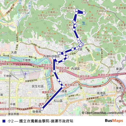 See why over 2 million users trust and consider busmaps.com as the best public transport website. busmaps gives you Taipei Buses suggested routes, real-time bus tracker, line route maps in Taipei, and helps to find the closest 小2 bus stops near you. No internet available? Download an offline PDF map and bus schedule for the 小2 bus to take on your trip.