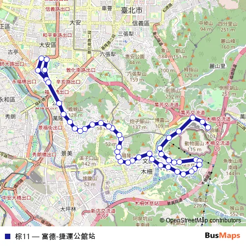 See why over 2 million users trust and consider busmaps.com as the best public transport website. busmaps gives you Taipei Buses suggested routes, real-time bus tracker, line route maps in Taipei, and helps to find the closest 棕11 bus stops near you. No internet available? Download an offline PDF map and bus schedule for the 棕11 bus to take on your trip.