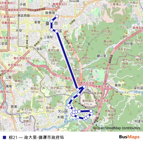 See why over 2 million users trust and consider busmaps.com as the best public transport website. busmaps gives you Taipei Buses suggested routes, real-time bus tracker, line route maps in Taipei, and helps to find the closest 棕21 bus stops near you. No internet available? Download an offline PDF map and bus schedule for the 棕21 bus to take on your trip.