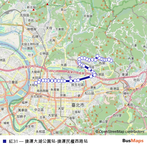 See why over 2 million users trust and consider busmaps.com as the best public transport website. busmaps gives you Taipei Buses suggested routes, real-time bus tracker, line route maps in Taipei, and helps to find the closest 紅31 bus stops near you. No internet available? Download an offline PDF map and bus schedule for the 紅31 bus to take on your trip.
