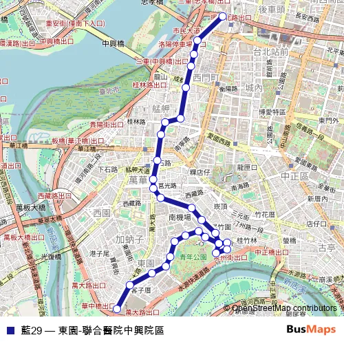 The first stop of the 藍29 bus route is 華中河濱公園 and the last stop is 聯合醫院中興院區. 藍29 (東園-聯合醫院中興院區) is operational during everyday.