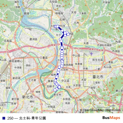 See why over 2 million users trust and consider busmaps.com as the best public transport website. busmaps gives you Taipei Buses suggested routes, real-time bus tracker, line route maps in Taipei, and helps to find the closest 250 bus stops near you. No internet available? Download an offline PDF map and bus schedule for the 250 bus to take on your trip.