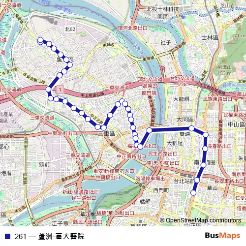 See why over 2 million users trust and consider busmaps.com as the best public transport website. busmaps gives you Taipei Buses suggested routes, real-time bus tracker, line route maps in Taipei, and helps to find the closest 261 bus stops near you. No internet available? Download an offline PDF map and bus schedule for the 261 bus to take on your trip.