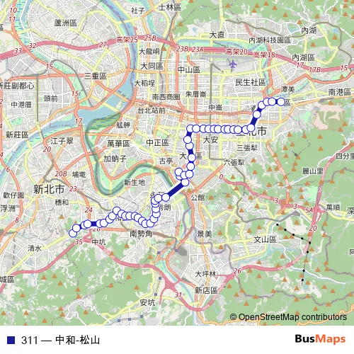 See why over 2 million users trust and consider busmaps.com as the best public transport website. busmaps gives you Taipei Buses suggested routes, real-time bus tracker, line route maps in Taipei, and helps to find the closest 311 bus stops near you. No internet available? Download an offline PDF map and bus schedule for the 311 bus to take on your trip.