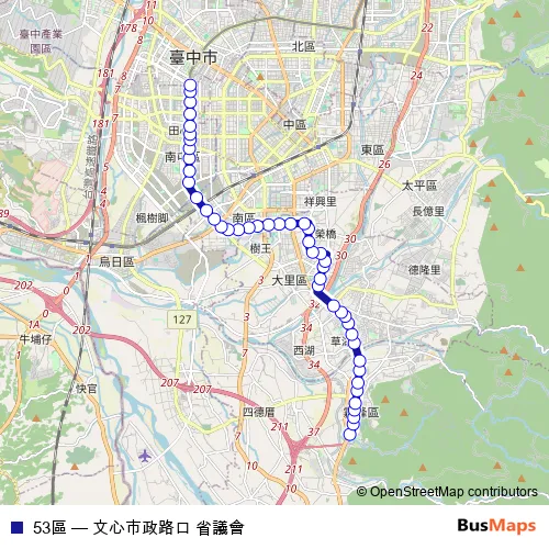 See why over 2 million users trust and consider busmaps.com as the best public transport website. busmaps gives you Taichung Buses suggested routes, real-time bus tracker, line route maps in Taichung, and helps to find the closest 53區 bus stops near you. No internet available? Download an offline PDF map and bus schedule for the 53區 bus to take on your trip.