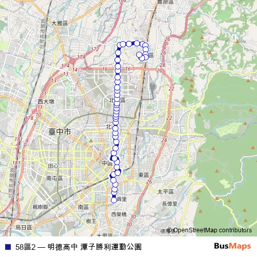 See why over 2 million users trust and consider busmaps.com as the best public transport website. busmaps gives you Taichung Buses suggested routes, real-time bus tracker, line route maps in Taichung, and helps to find the closest 58區2 bus stops near you. No internet available? Download an offline PDF map and bus schedule for the 58區2 bus to take on your trip.