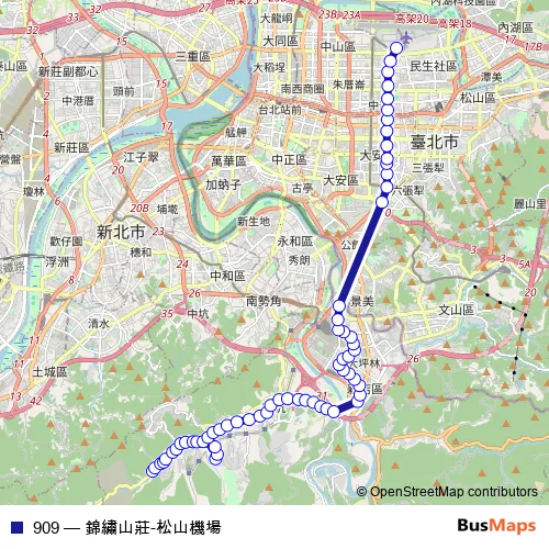 See why over 2 million users trust and consider busmaps.com as the best public transport website. busmaps gives you Taipei Buses suggested routes, real-time bus tracker, line route maps in Taipei, and helps to find the closest 909 bus stops near you. No internet available? Download an offline PDF map and bus schedule for the 909 bus to take on your trip.