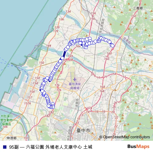 The first stop of the 95副 bus route is TC 六福公園 and the last stop is TC 土城東路. 95副 (六福公園 外埔老人文康中心 土城) is operational during everyday.