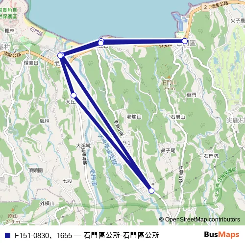 The first stop of the F151-0830、1655 bus route is 石門區公所 and the last stop is 石門區公所. F151-0830、1655 (石門區公所-石門區公所) is operational during on weekdays.