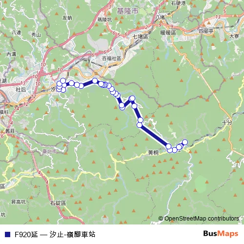 The first stop of the F920延 bus route is 嶺腳車站 and the last stop is 汐止火車站. F920延 (汐止-嶺腳車站) is operational during on weekdays.