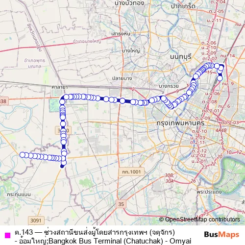 The first stop of the ต.143 bus route is จุดขึ้นลง;visual stop and the last stop is ไวไว;Wai Wai. ต.143 (ช่วงสถานีขนส่งผู้โดยสารกรุงเทพฯ (จตุจักร) - อ้อมใหญ่;Bangkok Bus Terminal (Chatuchak) - Omyai) is operational during everyday.