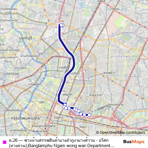 The first stop of the ต.26 bus route is ตรงข้ามพันธุ์ทิพย์งามวงศ์วาน;Pantip Ngamwongwan (Opposite) and the last stop is ก่อนแยก อ.ส.ม.ท;Before Mcot Junction. ต.26 (ช่วงห้างสรรพสินค้าบางลำภูงามวงศ์วาน - อโศก (ทางด่วน);Banglamphu Ngam wong wan Department Store - Asok (Highway)) is operational during everyday.