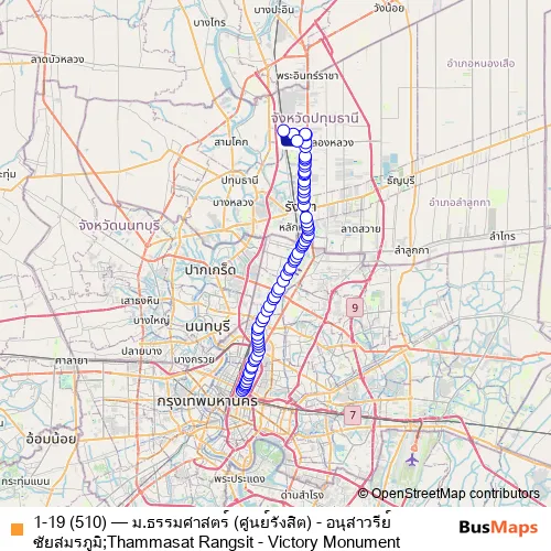 The first stop of the 1-19 (510) bus route is อนุสาวรีย์ชัยสมรภูมิ (เกาะพหลโยธิน);Victory Monument (Phahon Yothin) and the last stop is อู่ธรรมศาสตร์;Bus Depot Thammasat. 1-19 (510) (ม.ธรรมศาสตร์ (ศูนย์รังสิต) - อนุสาวรีย์ชัยสมรภูมิ;Thammasat Rangsit - Victory Monument) is operational during everyday.
