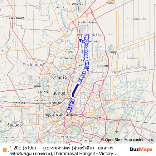 The first stop of the 1-20E (510e) bus route is อู่ธรรมศาสตร์;Bus Depot Thammasat and the last stop is อนุสาวรีย์ชัยสมรภูมิ (เกาะพหลโยธิน);Victory Monument (Phahon Yothin). 1-20E (510e) (ม.ธรรมศาสตร์ (ศูนย์รังสิต) - อนุสาวรีย์ชัยสมรภูมิ (ทางด่วน);Thammasat Rangsit - Victory Monument (Expressway)) is operational during everyday.