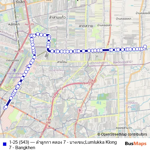 The first stop of the 1-25 (543) bus route is อู่บางเขน;Bus Depot Bangkhen and the last stop is ท่ารถตลาดใหญ่ลำลูกกา คลอง 7 (สาย 543);Talad Yai Lamlukka Khlong 7 Bus Terminal (543). 1-25 (543) (ลำลูกกา คลอง 7 - บางเขน;Lumlukka Klong 7 - Bangkhen) is operational during everyday.