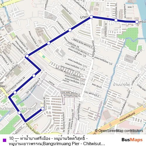 The first stop of the 10 bus route is จุดขึ้นลง;visual stop and the last stop is จุดขึ้นลง;visual stop. 10 (ท่าน้ำบางศรีเมือง - หมู่บ้านจิตต์วิสุทธิ์ - หมู่บ้านเยาวพรรณ;Bangsrimuang Pier - Chitwisut Village - Yaowaphan Village) is operational during everyday.