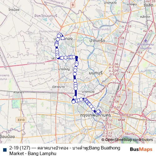 The first stop of the 2-19 (127) bus route is ตลาดบางบัวทอง;Bang Bua Thong Market and the last stop is วัดบวรนิเวศฯ (ฝั่งบวรนิเวศน์);Wat Bowonniwet (Bowonniwet side). 2-19 (127) (ตลาดบางบัวทอง - บางลำพู;Bang Buathong Market - Bang Lamphu) is operational during everyday.