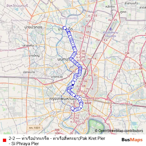 The first stop of the 2-2 bus route is ท่าเรือปากเกร็ด;Pakkret Pier and the last stop is ท่าน้ำสี่พระยา;Si Phraya Pier. 2-2 (ท่าเรือปากเกร็ด - ท่าเรือสี่พระยา;Pak Kret Pier - Si Phraya Pier) is operational during everyday.