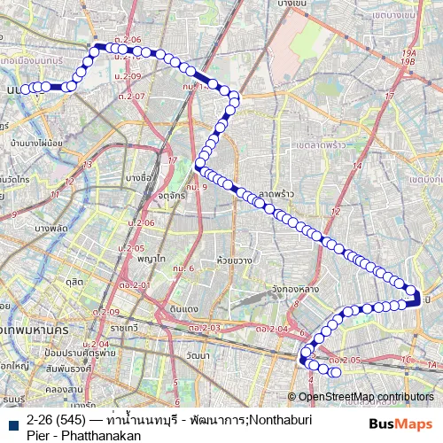 The first stop of the 2-26 (545) bus route is ท่าน้ำนนทบุรี;Nonthaburi Pier and the last stop is ซอยพัฒนาการ 21;Soi Phatthanakan 21. 2-26 (545) (ท่าน้ำนนทบุรี - พัฒนาการ;Nonthaburi Pier - Phatthanakan) is operational during everyday.