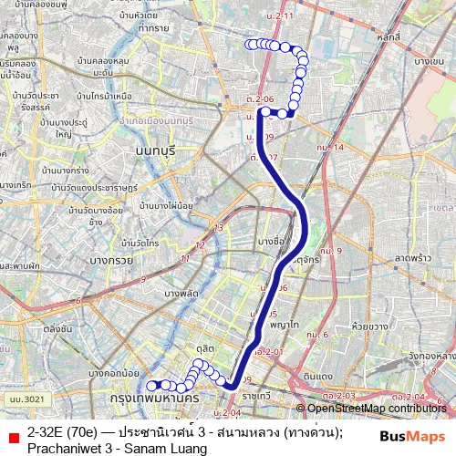 The first stop of the 2-32E (70e) bus route is ท่ารถประชานิเวศน์ 3;Prachaniwet Bus Terminal 3 and the last stop is สนามหลวง (ตรงข้ามม.ธรรมศาสตร์);Sanamluang (Opposite Thammasart U.). 2-32E (70e) (ประชานิเวศน์ 3 - สนามหลวง (ทางด่วน);Prachaniwet 3 - Sanam Luang) is operational during everyday.