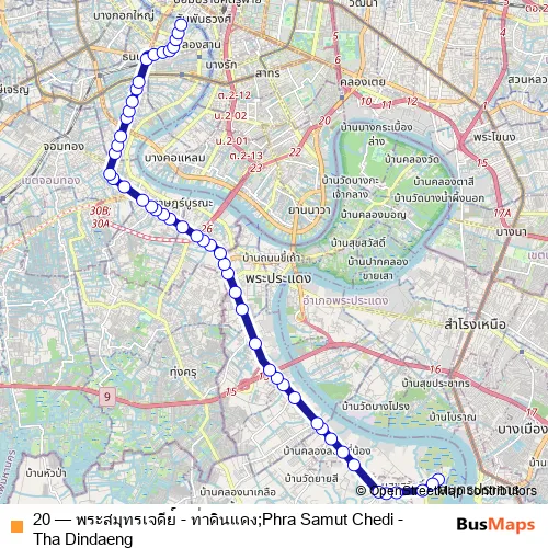 The first stop of the 20 bus route is พระสมุทรเจดีย์;Phra Samut Chedi and the last stop is ท่าดินแดง;Din Daeng Pier. 20 (พระสมุทรเจดีย์ - ท่าดินแดง;Phra Samut Chedi - Tha Dindaeng) is operational during everyday.