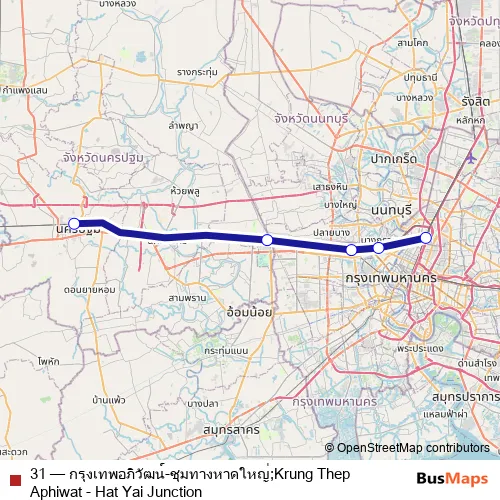 The first stop of the 31 rail route is SRT กรุงเทพอภิวัฒน์;Srt Bangkok (Krung Thep Aphiwat) and the last stop is SRT นครปฐม;Srt Nakhon Pathom. 31 (กรุงเทพอภิวัฒน์-ชุมทางหาดใหญ่;Krung Thep Aphiwat - Hat Yai Junction) is operational during everyday.