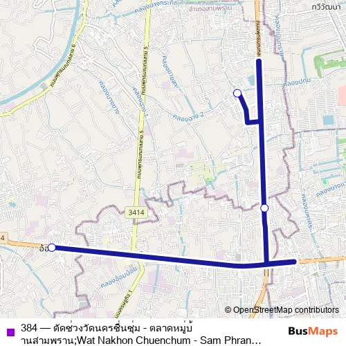 The first stop of the 384 bus route is วัดนครชื่นชุ่ม;Wat Nakhon Chuenchum and the last stop is ตลาดหมู่บ้านสามพราน;Sam Phran Housing Market. 384 (ตัดช่วงวัดนครชื่นชุ่ม - ตลาดหมู่บ้านสามพราน;Wat Nakhon Chuenchum - Sam Phran Village Market) is operational during everyday.