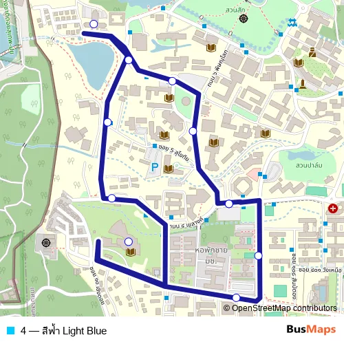 The first stop of the 4 bus route is ลานจอดรถหอหญิง 3 and the last stop is ลานจอดรถหอหญิง 3. 4 (สีฟ้า Light Blue) is operational during everyday.