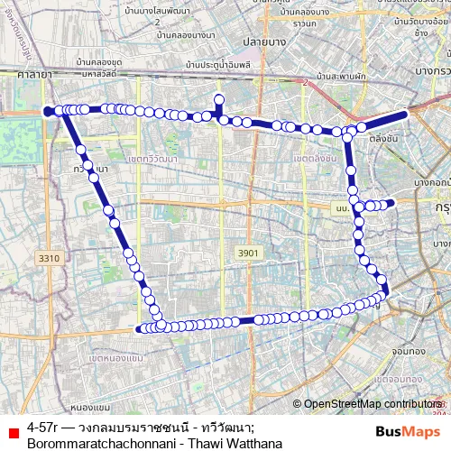 The first stop of the 4-57r bus route is อู่บรมราชชนนี;Borommaratchachonnani Bus Depot and the last stop is อู่บรมราชชนนี (จุดสิ้นสุด);Borommaratchachonnani Bus Depot. 4-57r (วงกลมบรมราชชนนี - ทวีวัฒนา;Borommaratchachonnani - Thawi Watthana) is operational during everyday.