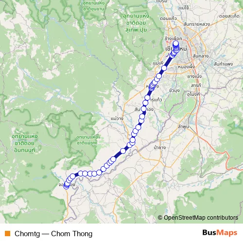 The first stop of the Chomtg bus route is สถานีตำรวจภูธรอำเภอจอมทอง Chom Thong Police Station and the last stop is ช้างเผือก Chang Phueak. Chomtg (Chom Thong) is operational during everyday.